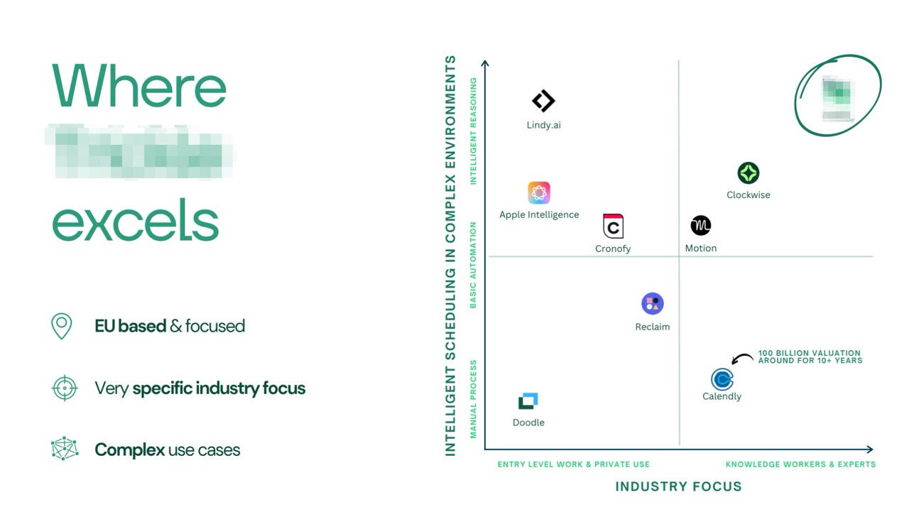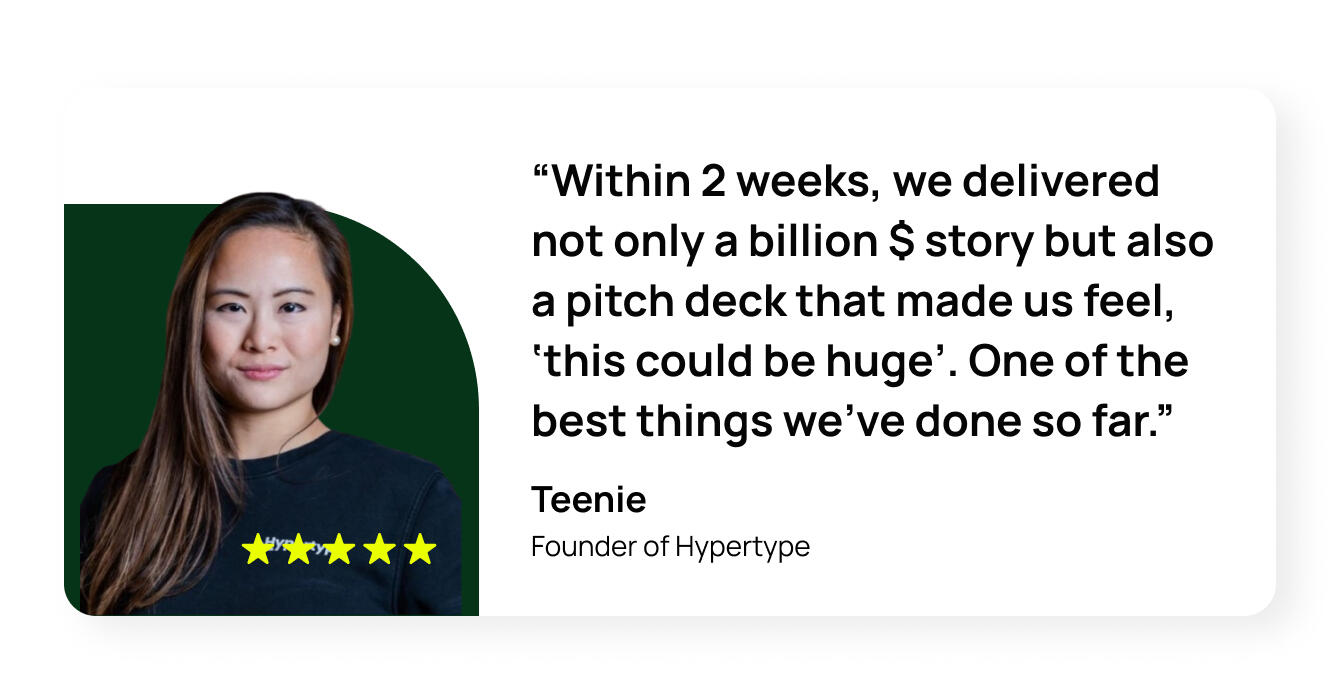 Two calls a day. You give raw input, I extract and create.We build your story, deck, objection handling, elevator pitch and one liner in days — not months.