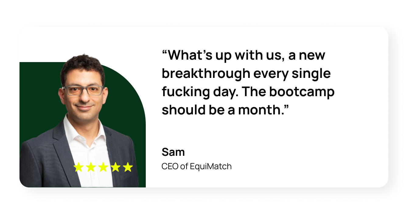 We dig into your goals, story gaps, past pitch pain and fundraising fundamentals so we hit bootcamp at full speed.