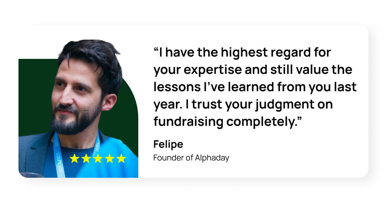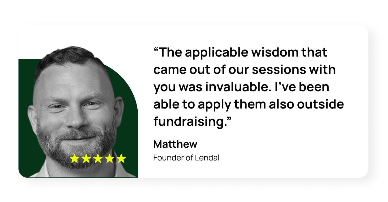 I get it. I’ve been there. Most consultants promise you the world, then give you a playbook and disappear.Not me. I sit with you in the mud. This is 1:1, deep work.I’ve helped 100+ founders raise — not because I have all the answers, but because I’ve made all the mistakes.Happy to send interviews with my clients. Just drop me a line at [email protected]. But in the end, listen to your gut.