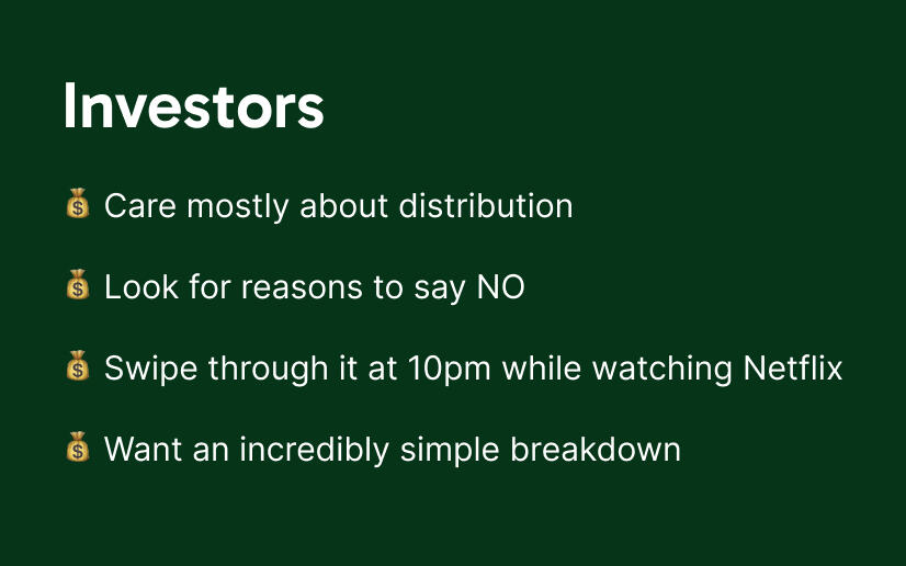 We rebuild it from scratch — cut the noise, fix the story, and strip out silent deal-breakers.You talk. I write. Then our designer makes it look like it belongs in a partner meeting at Sequoia.So you stop tweaking and your calendar starts filling up.
